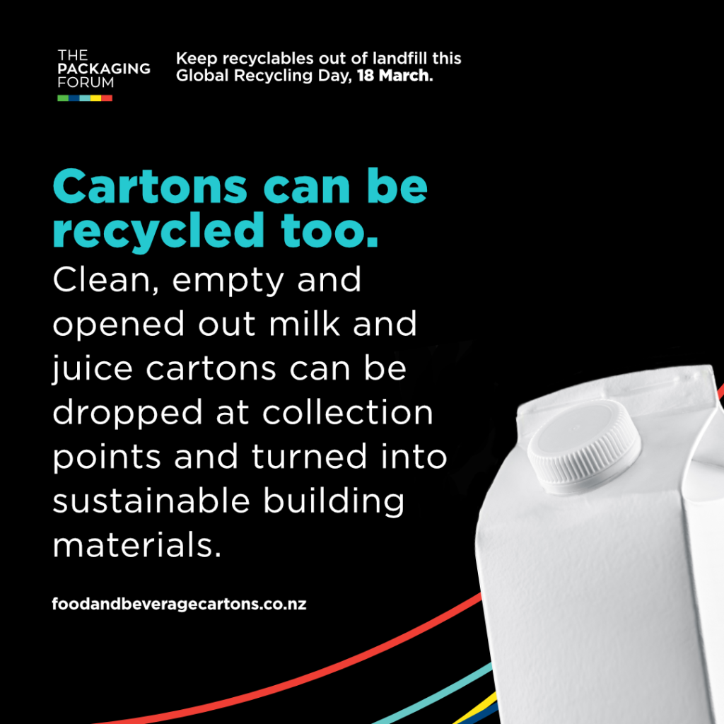 Empty, clean juice and milk cartons can be recycled into incredible building supplies. There are more than 100 collection points in cafes and community hubs across New Zealand.